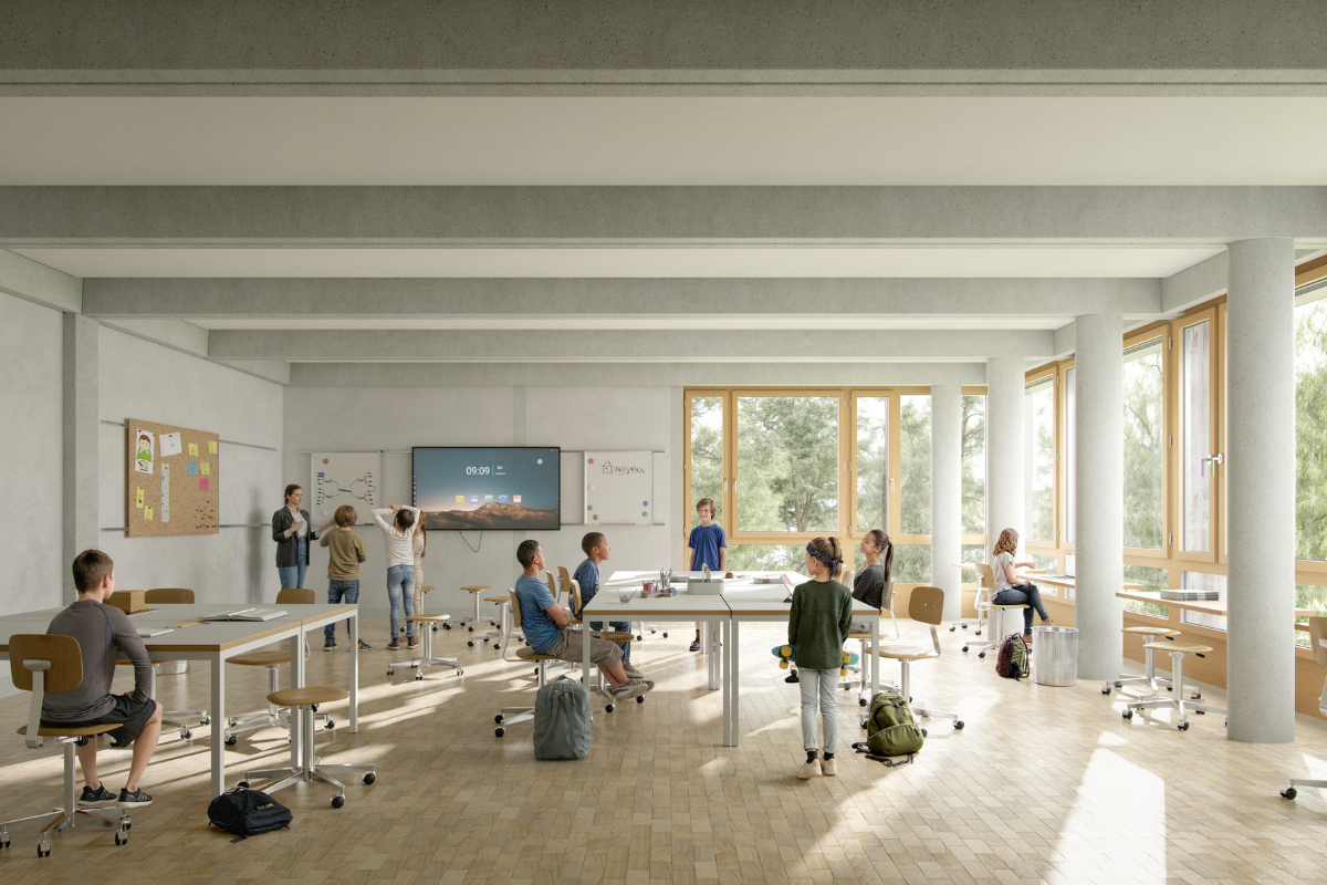 Während der gesamten Bauzeit bleibt der Schulbetrieb aufrechterhalten, teilweise in provisorischen Räumen. In einer etappierten Bauweise wird zuerst der Ersatzneubau (Etappe 1) realisiert, bevor die Sanierung des Bestands (Etappe 2) erfolgt. Minimalinvasive Eingriffe sorgen dafür, dass die bestehende Tragstruktur dort, wo nötig, verstärkt, aber weitgehend erhalten bleibt.
